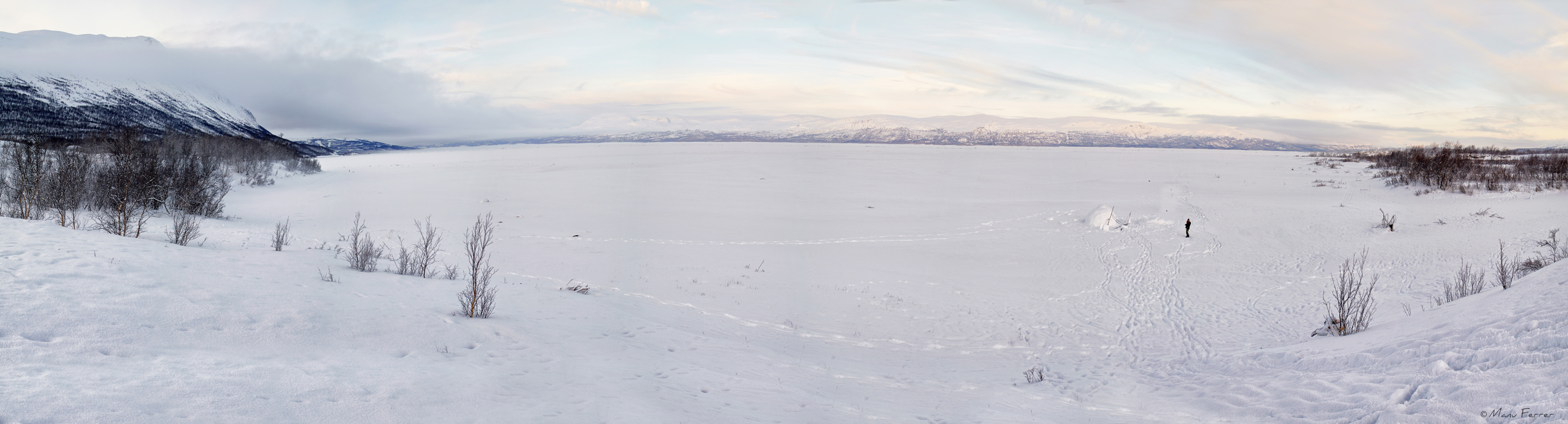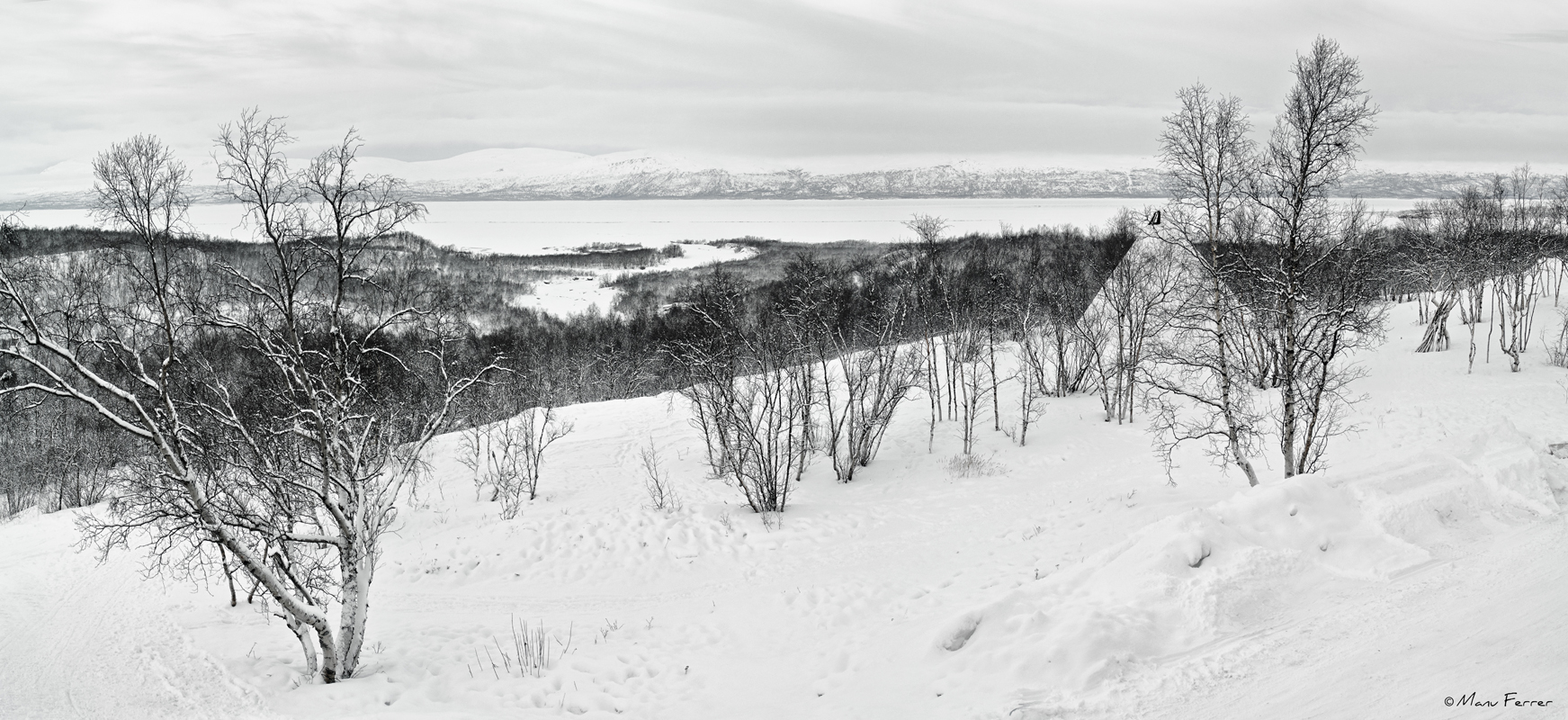 Paisaje nevado de suaves colinas en el horizonte, bosques de abedules con la desnudez de sus ramas y la imponente presencia del lago helado hacen que el sitio nos atrape desde el primer momento.